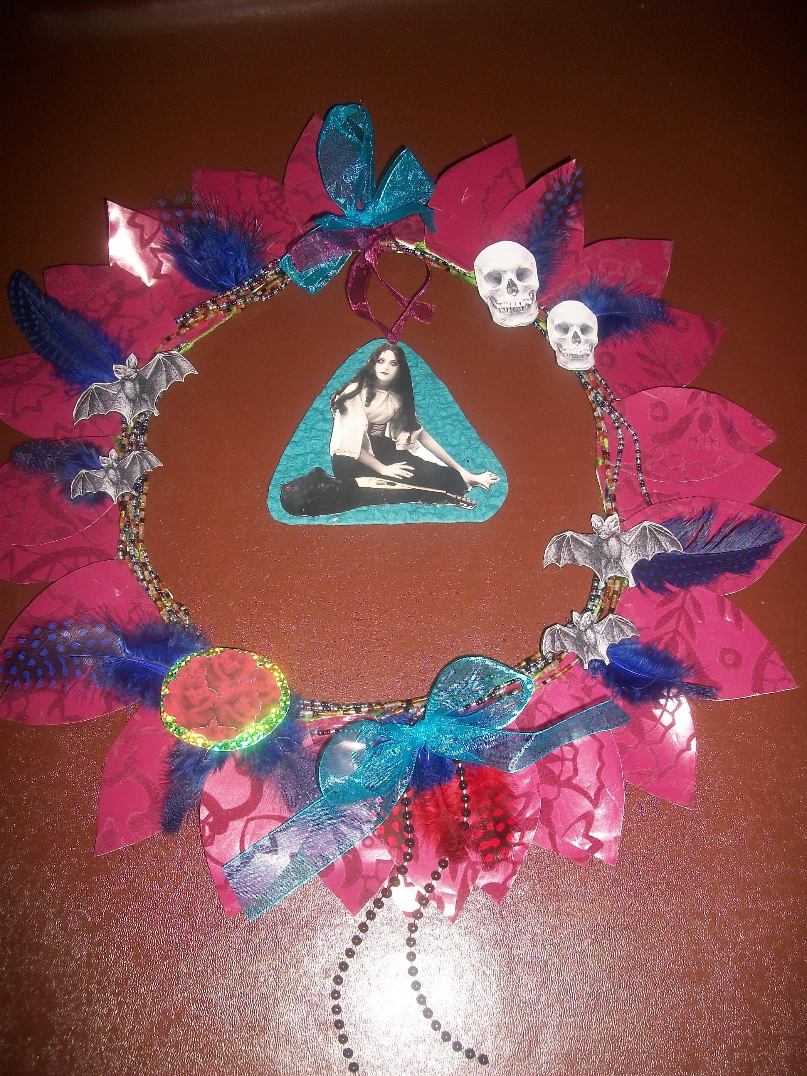 I have been getting crafty this weekend, and am very pleased with the results! I decided to make a Halloween wreath for my front door, but I wanted it to reflect my pagan values while still being quite fun.